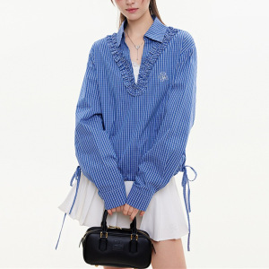 ikyou设计感小众v领格子衬衫女长袖春夏新款收腰显瘦百搭休闲衬衣