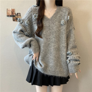大码女装宽松慵懒立体花朵长袖毛衣秋季2025新款胖mm灰色针织上衣