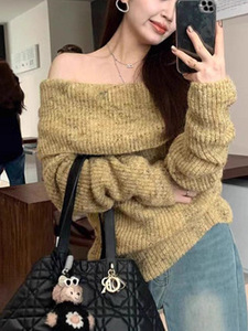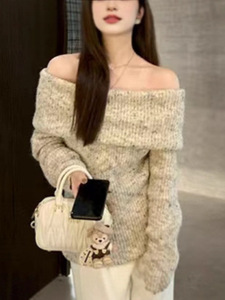 原版新品女装针织衫韩系慵懒风一字肩翻领两穿别致百搭套头毛衣