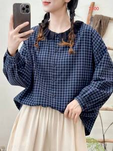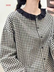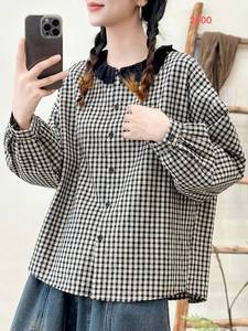 日系森女格子蕾丝花边小翻领女士开衫长袖衬衫批发潮