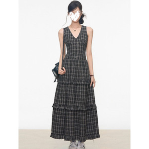 小众复古宽松毛衣开衫外套女灰色格纹无袖长裙蛋糕连衣裙两件套装