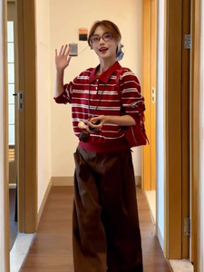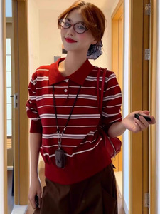 红色条纹针织长袖t恤女秋冬2025新款韩系氛围感穿搭巨好看上衣