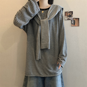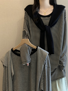 早秋2025新款别致披肩条纹长袖针织衫大码女装胖mm宽松打底衫上衣