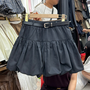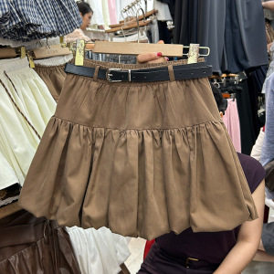 韩系复古纯色花苞短裙2025春秋新款减龄百搭配腰带半身裙女咖色
