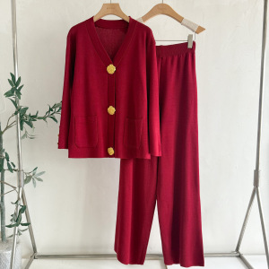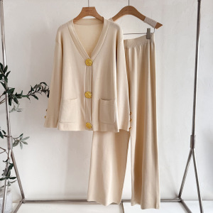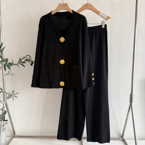 跨境大扣子针织毛衣两件套女秋冬2025年新款宽松休闲阔腿裤套装潮