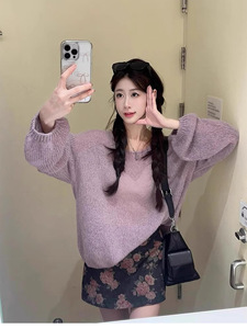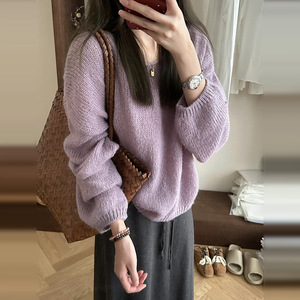 秋冬季2025新款设计感小众宽松软糯长袖上衣温柔风紫色针织毛衣女