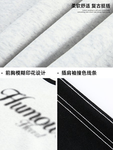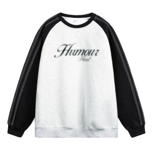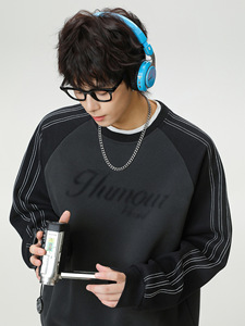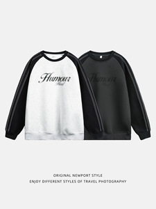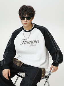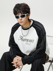 撞色明线插肩袖圆领卫衣男秋冬新款美式复古模糊网点印花上衣外套