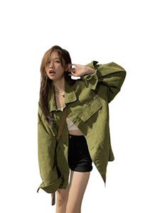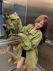 Polo领长袖宽松绿色牛仔外套女秋冬大码胖妹妹中长款夹克开衫上衣