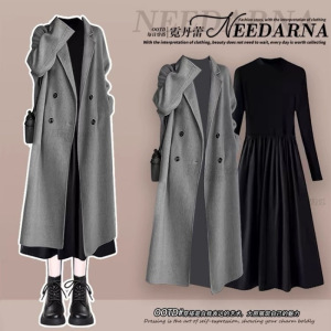 秋冬连衣裙一整套2025复古港风大衣韩系高级风衣新款外套显瘦套装