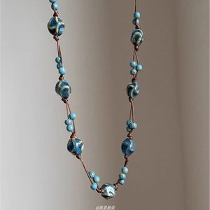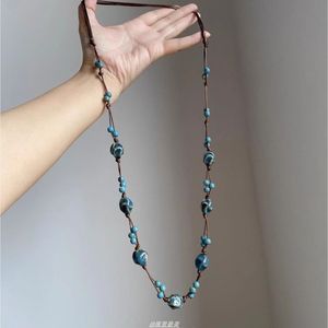 新中式国风蓝色陶瓷串珠项链女民族风编织吊坠长款毛衣链高级颈链