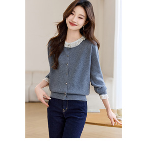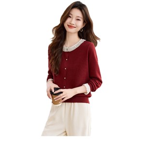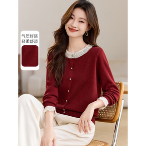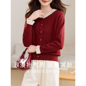 法式轻熟风酒红色针织开衫女2025秋季新款蕾丝钉珠毛衣小香风上衣
