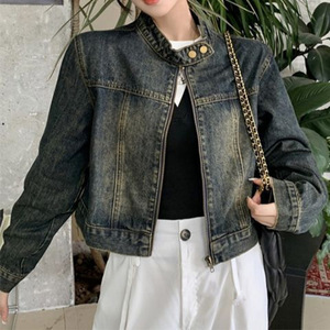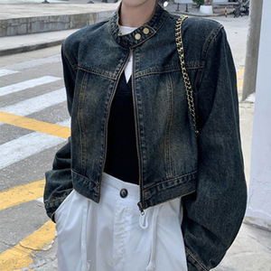 美式复古做旧立领牛仔外套女春秋季高级感宽松小个子短款夹克上衣