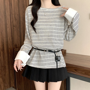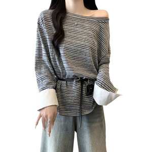 大码女装2025夏季新款胖mm韩版条纹露肩宽松长袖腰带遮肉上衣