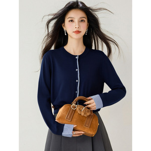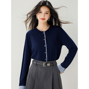 2025秋冬新款韩版时尚简约假两件设计感拼接格纹长袖开衫针织衫女