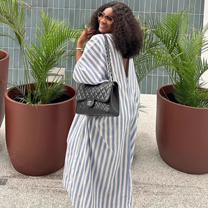 欧美女装时尚宽松慵懒风深V领长款条纹连衣裙女非洲洋气大码长裙
