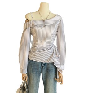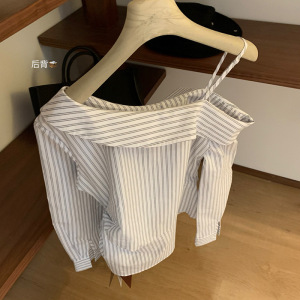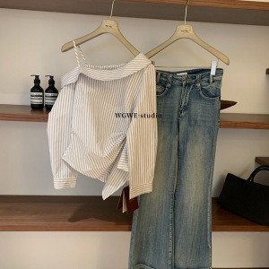 WGWE7064设计感斜领露肩条纹绑带衬衫女纯欲收腰显瘦百搭长袖上衣