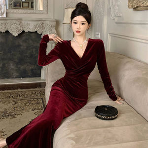 2025秋冬新款气质红色春秋金丝绒连衣裙丝绒礼服鱼尾显瘦