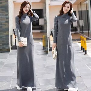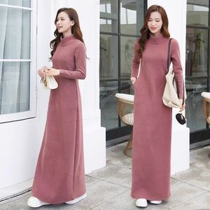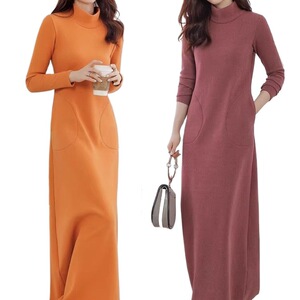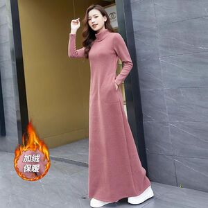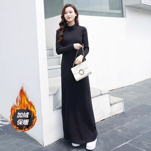 秋冬加绒超长半高领连衣裙新款修身拖地裙长裙加厚秋冬a字打底裙