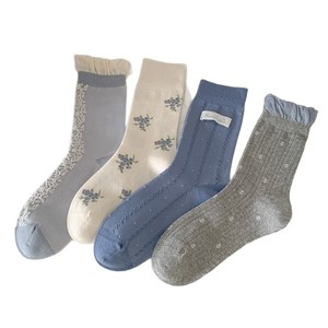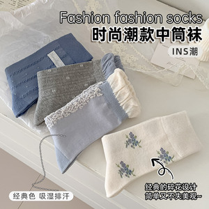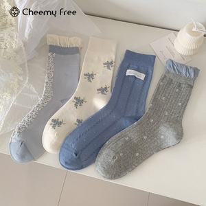 CHEEMY FREE新款蓝灰色系中筒女袜子秋冬小清新简约百搭ins风棉袜