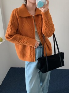 复古针织开衫女装秋冬新款跨境宽松慵懒风麻花翻领拉链毛衣外套女