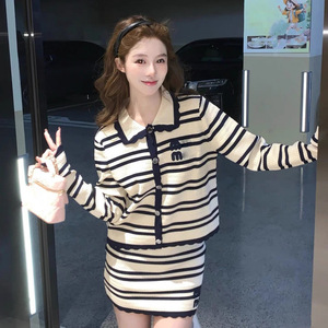 2025早秋新款学院风撞色条纹针织开衫外套+半身裙套装女两件套女