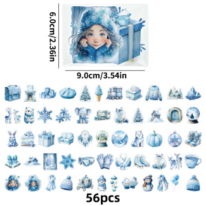 56张跨境新款透明pet贴纸蓝色冬季奇迹雪人手套创意素材装饰贴画