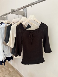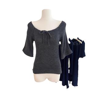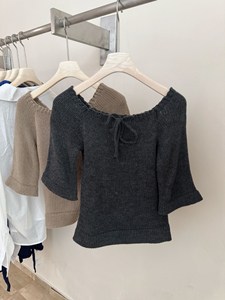 秋季 毛织编织一字肩方领‘两穿’中袖复古毛衣