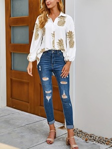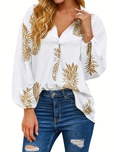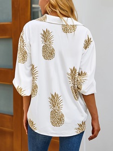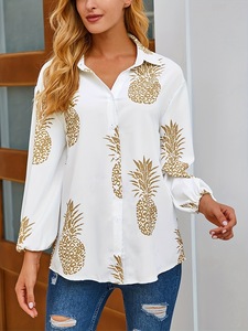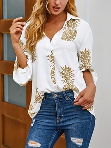 现货2025秋季女式跨境欧美水果菠萝印花翻领长袖衬衫