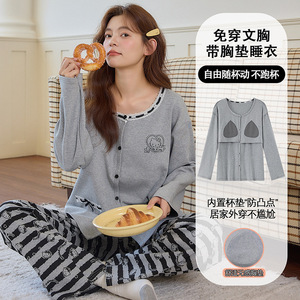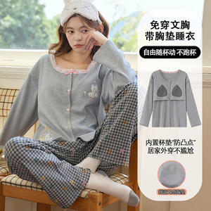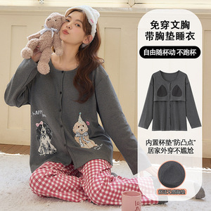秋冬季睡衣女士2025胸垫款纯棉开衫长袖套装带胸垫简约宽松家居服