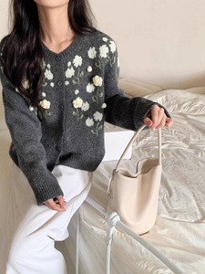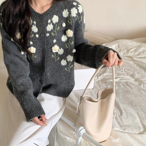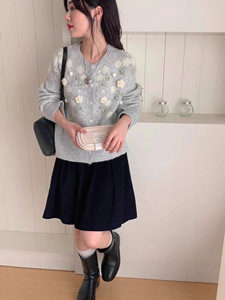 韩风温柔立体花朵细腻软糯毛衣开衫女气质高级感圆领宽松针织外套
