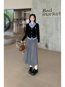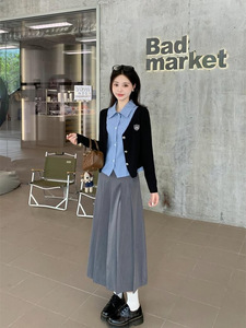 春秋温柔学院风撞色假两件套装chic设计长袖时尚修身百搭潮流上衣