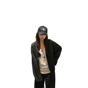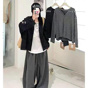 休闲慵懒风简约条纹v领开衫外套+背心+长裤黑条开衫休闲裤