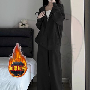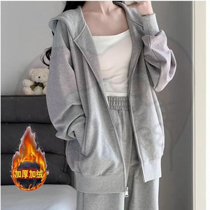 休闲运动套装女秋冬新款宽松连帽灰色卫衣阔腿裤两件套开衫外套潮