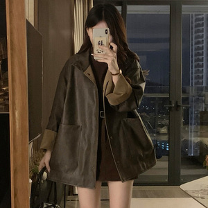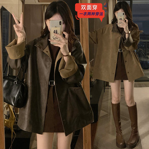 糖糖~咖色单排扣正反两面穿皮衣外套女年早秋宽松显瘦上衣潮