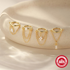 S925纯银几何镶钻流苏链条软骨耳轮环穿孔耳夹欧美热销气质耳饰品