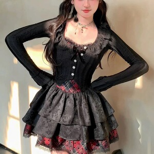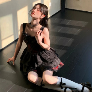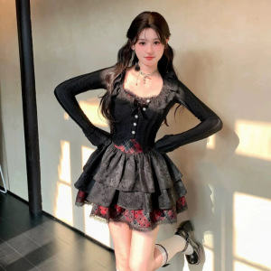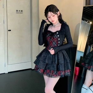 亚文化y2k赫暗黑系黑红格纹蕾丝开衫蝴蝶结蓬蓬吊带连衣裙两件套