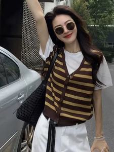 2025夏季新款时尚拼接撞色条纹短袖针织衫女设计感洋气假两件上衣