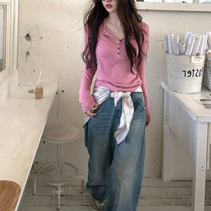 温柔风韩女亨利领chao舒服!撞色扣长袖打底tee上衣 2025秋季新款