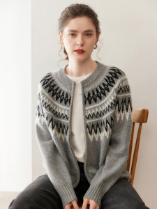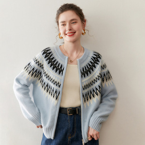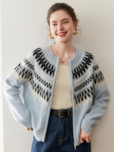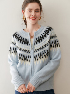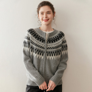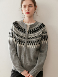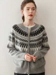 复古费尔岛提花山羊绒开衫女圆领拉链宽松慵懒风针织毛衣大码外套