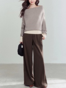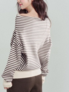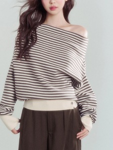 秋日摩卡'复古设计感一字肩条纹韩系休闲针织毛衣上衣