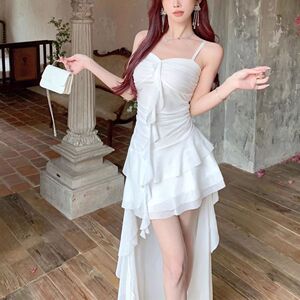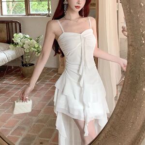 海边度假白色网纱拖尾荷叶边吊带连衣裙小众设计法式气质短裙夏季