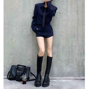 纯欲辣妹风少女藏蓝色条纹长袖衬衫显瘦西装短裤套装女春秋两件套