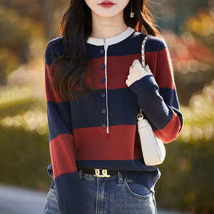 【厂家直供】半开条纹女士毛衣秋季新款外穿宽松百搭显瘦针织打底