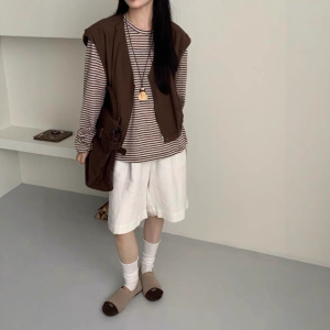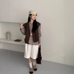 2025秋季新款韩版时尚条纹长袖T恤+宽松休闲V领马甲两件套5025