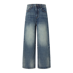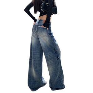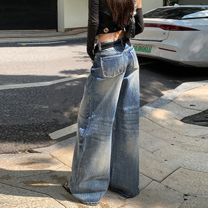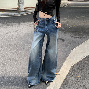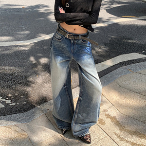 美式复古重工高腰阔腿牛仔裤女秋季新款水洗宽松弹力直筒拖地裤子