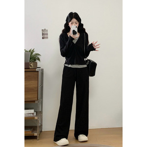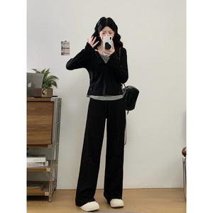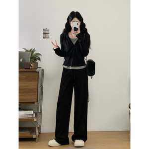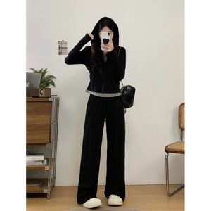 ~慵懒运动风韩版时尚撞色收腰连帽卫衣高腰显瘦长裤休闲套装