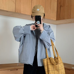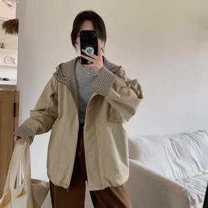 棉外套潮夹克女撞色连帽日系38慵懒新款格子上衣秋季