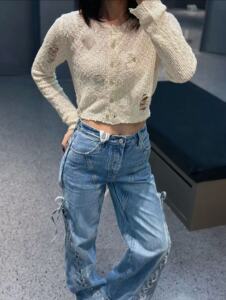 Ann2025早秋南油杏色黑色做旧镂空上衣设计感短款破洞毛织短开衫