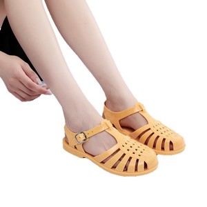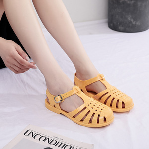 女士凉鞋夏季糖果色镂空包头凉鞋防滑外穿沙滩鞋塑料平底罗马凉鞋
