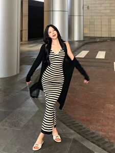 法式气质v领条纹吊带裙套装女夏季外搭防晒开衫收腰紧身包臀长裙